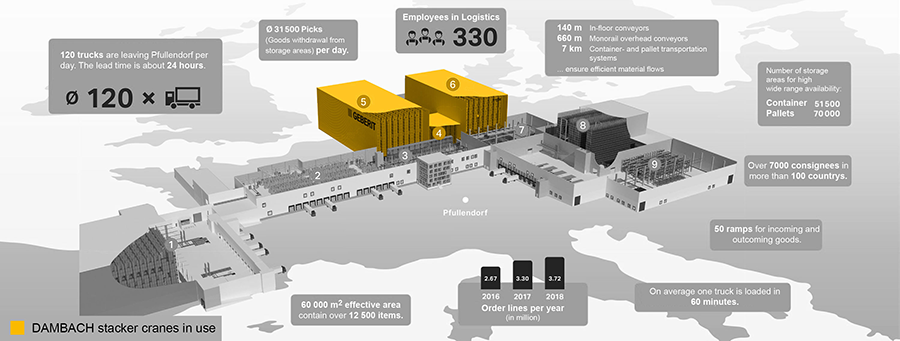 The market leader for sanitary products Geberit had already decided to expand its largest German location in Pfullendorf in 2014. Three years and an investment of 40 million later this project is realised and the DAMBACH storage and retrieval machines can show what they're made of.