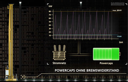 Die durchschnittliche Spitzenleistungsaufnahme von Paletten-RBG liegt heute zwischen 80 und 100 kW. Bei der Beschleunigung treten Stromspitzen von über 200 A im Sekundenbereich auf. Bei Einsatz von RBG mit Power Caps als Energiespeicher kann nicht nur der Installationsaufwand verringert, sondern auch die vom Netz aufgenommenen Leistungsspitzen reduziert werden.